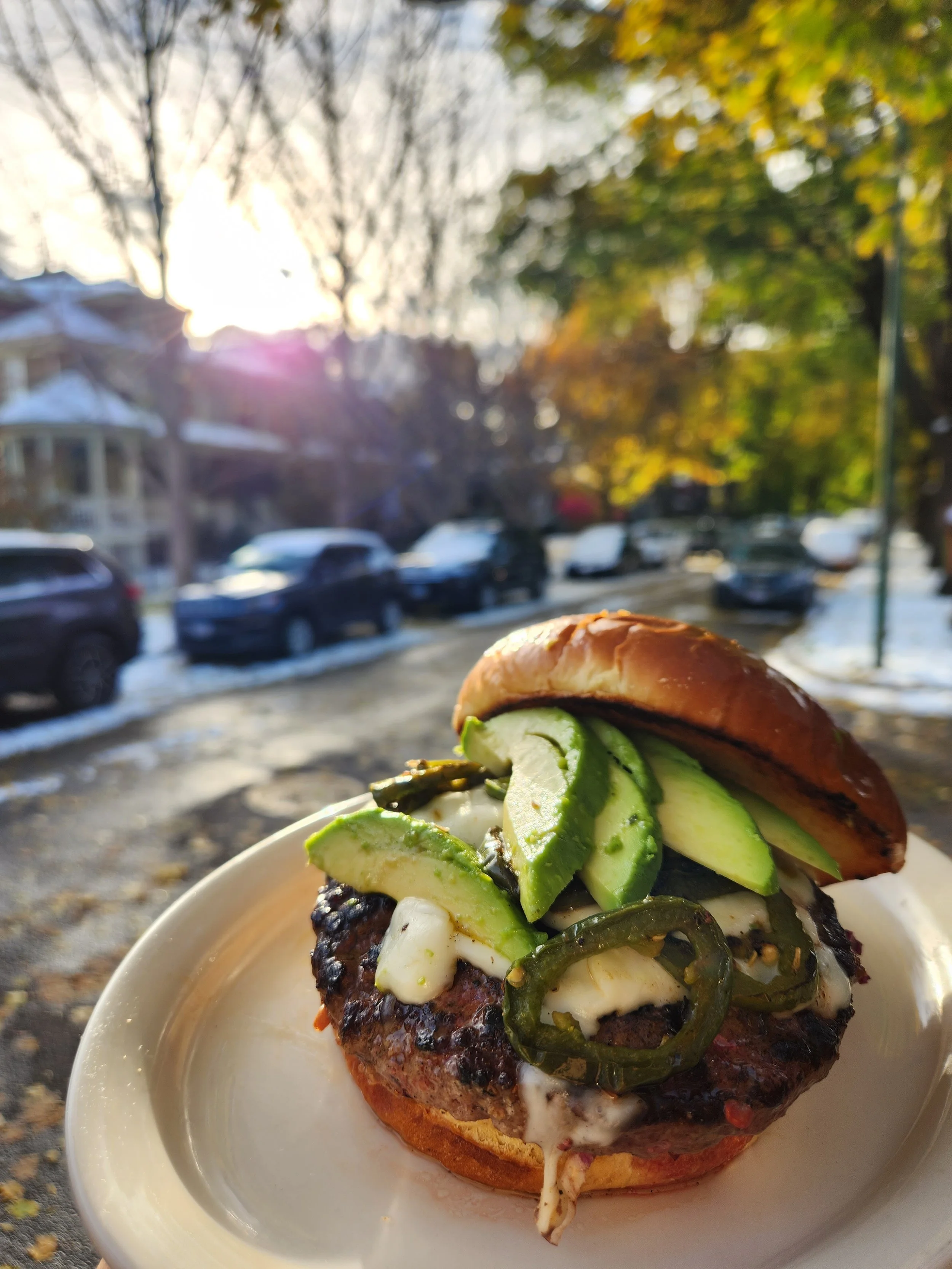 Our ½ lb CAB patty topped with hand shredded queso Oaxaca, roasted jalapeno, citrus slaw, avocado & ancho aioli–19