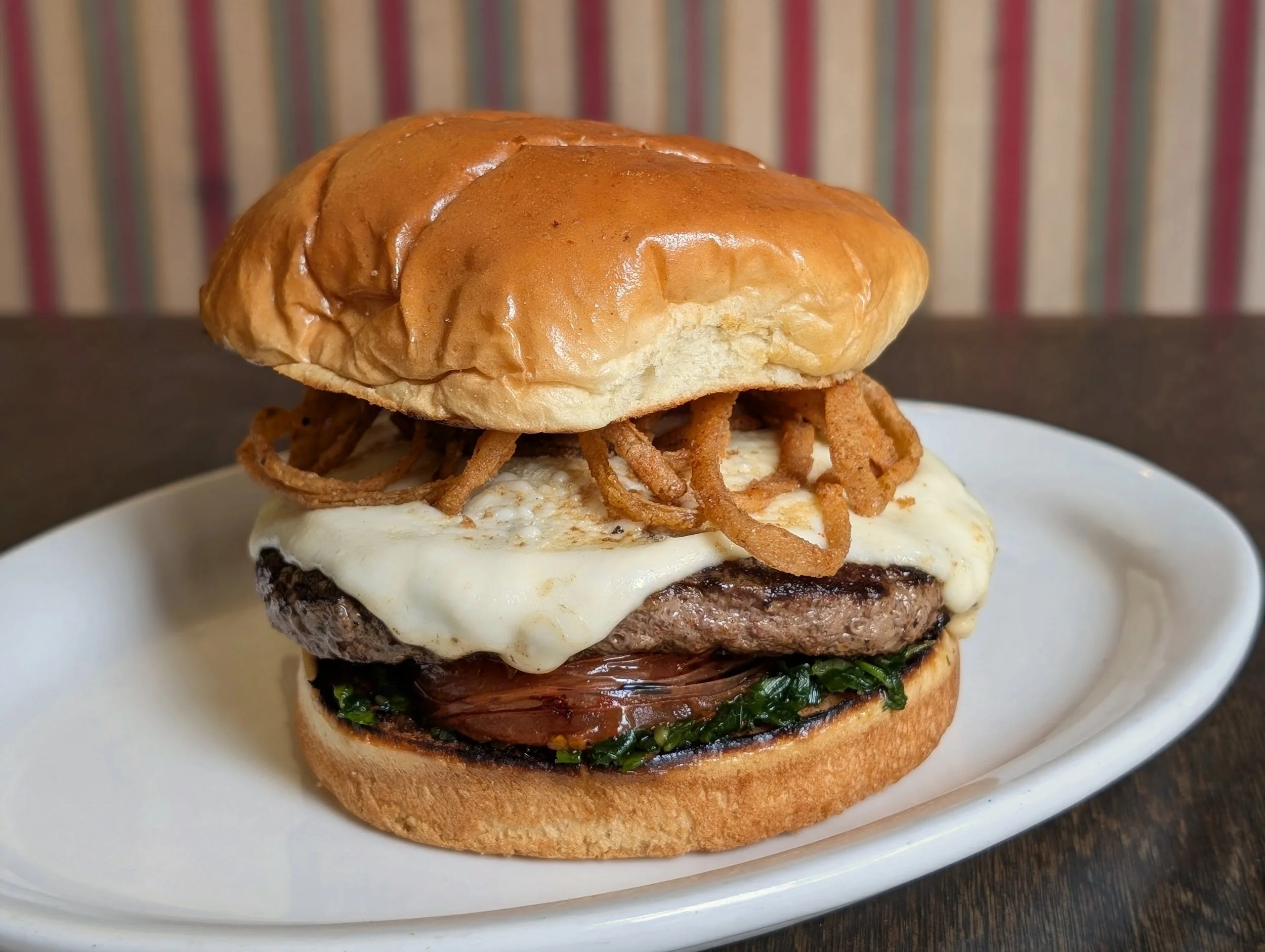 Our ½ lb CAB patty topped with arugula-chive pesto, mozzarella, roasted tomato, balsamic glaze & onion frizzles –19