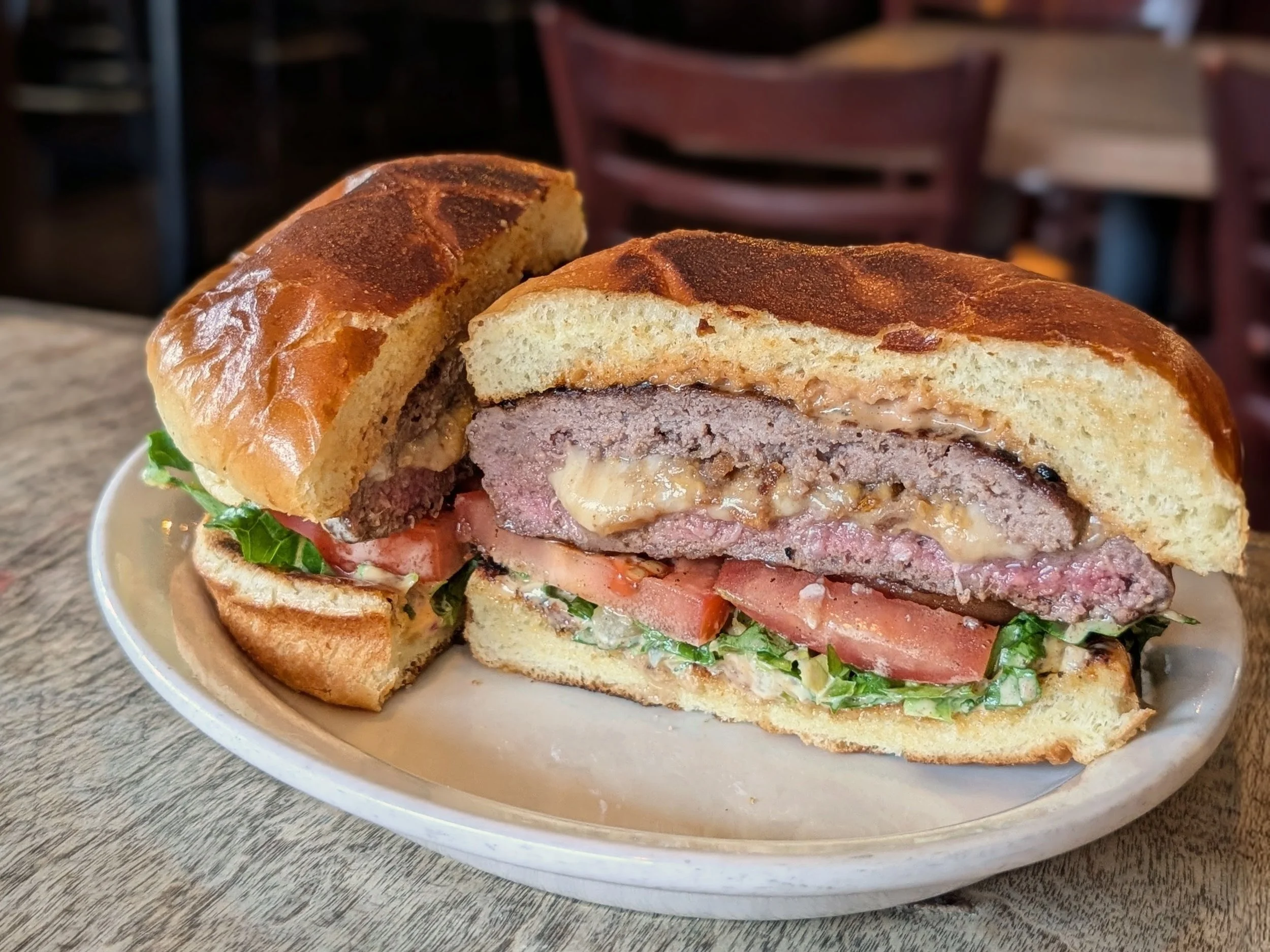Our ½ lb CAB patty stuffed with cheddar, chihuahua & crispy onions topped with bacon aioli, lettuce, tomato & golf sauce –19